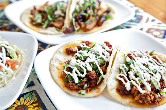 Tacos are among the highlights of the menu at Mama Chuy. The ones shown here are filled with carne asada, marinated pork, and chorizo. Photograph by Scott Suchman