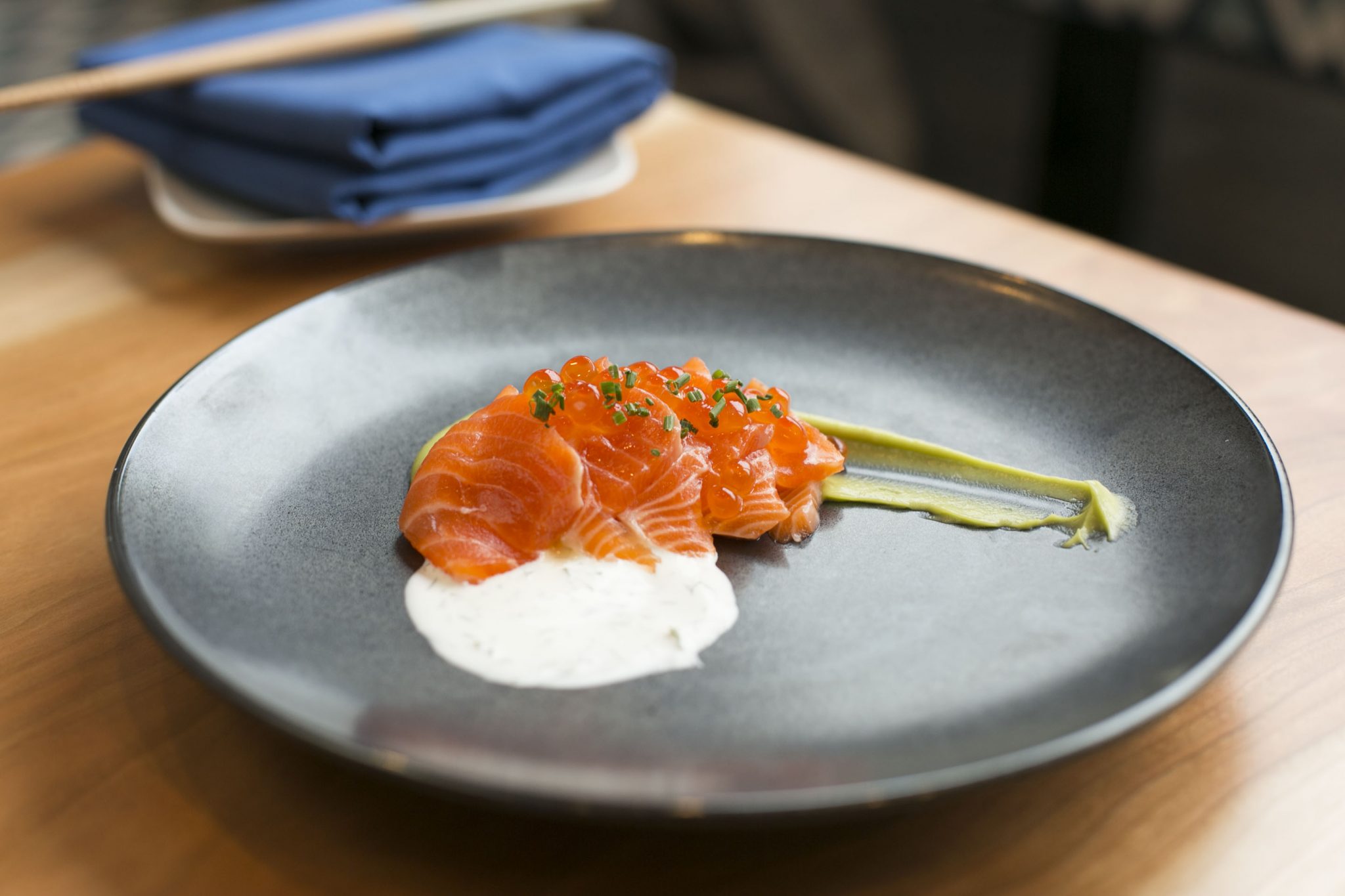 Place a tablespoon of avocado mousse on the plate and drag the tip of your spoon through it. Make a small pool of dill creme fraiche in the center of the plate, just below the avocado. Fold a few slices of smoked salmon and arrange them on top of the avocado and creme fraiche. Spoon the salmon roe into a line on top of the smoked salmon. Sprinkle the roe with the chopped chives. Serve immediately.