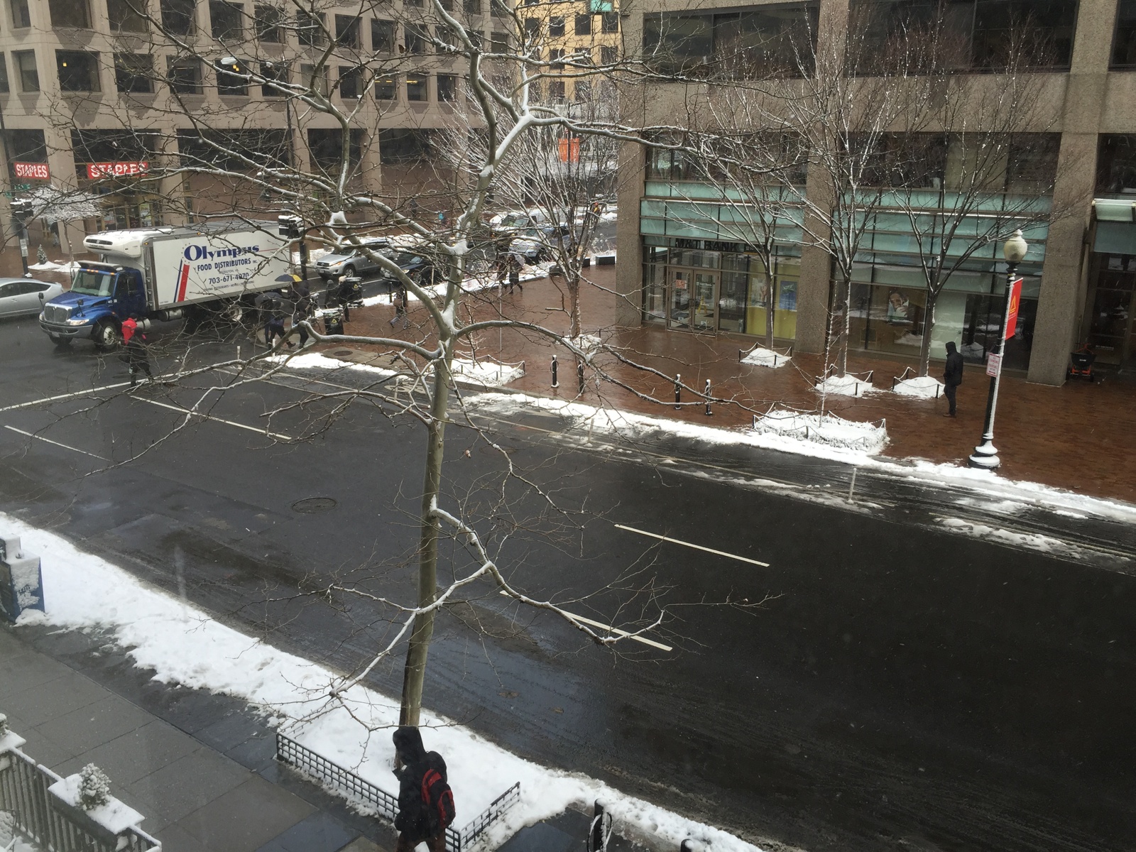 The photo above was taken from Washingtonian’s office. In the lower right-hand corner, you can see an individual walking down the sidewalk using an umbrella for protection. From what, exactly? Possibly the light snowfall that is currently dusting the city with, at most, three inches of fresh powder. As you can see, this umbrella-toting person is not alone. Peek through the trees and you’ll see two pedestrians on the corner of 19th and L streets, Northwest, underneath half-domes of water-resistant cloth.