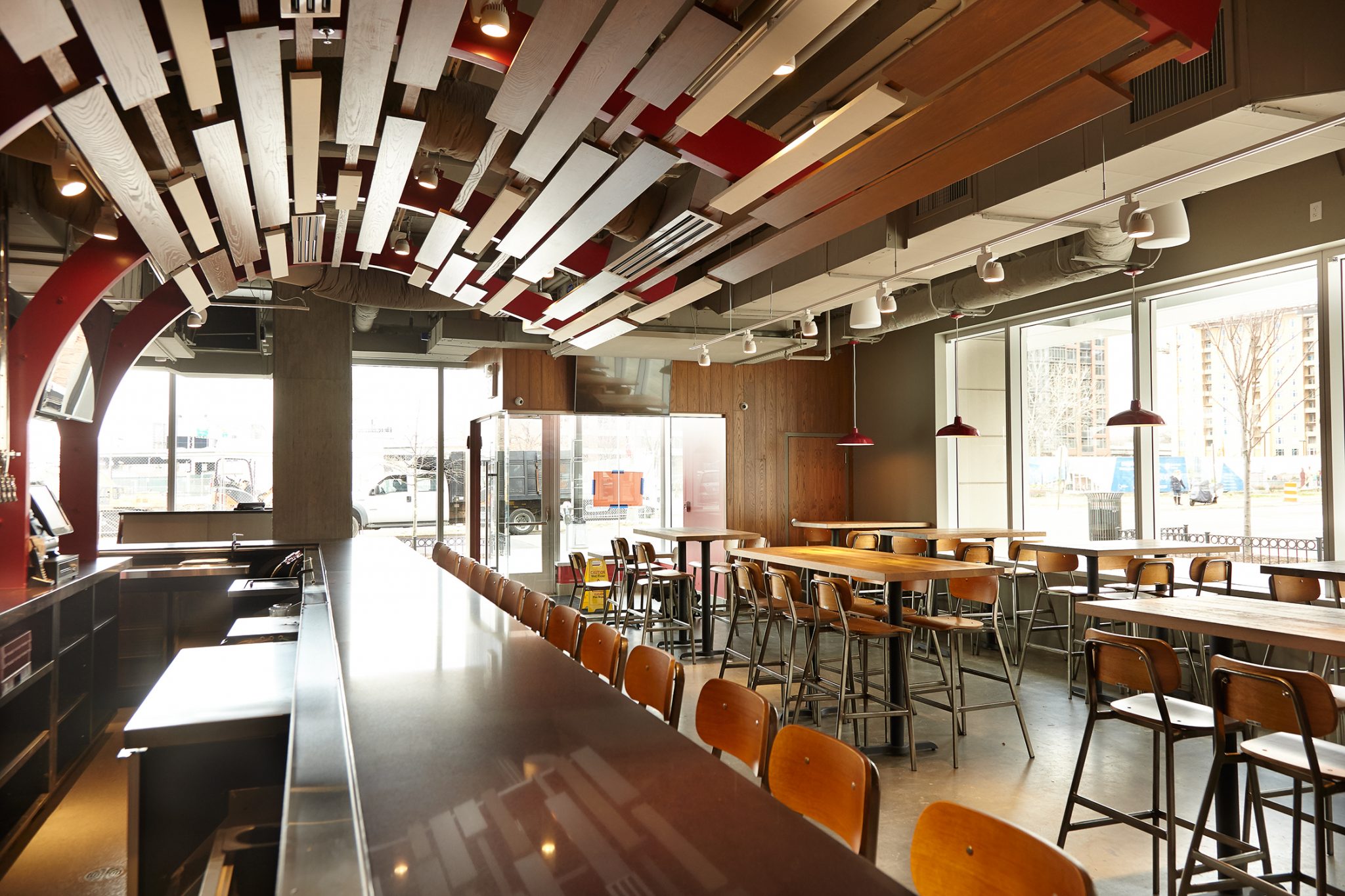 Local architecture and design firm GrizForm is behind the decor, as is the case with the Arlington shop. Though not a sports bar, drinkers can post up in the 90-seat lounge area equipped with televisions for watching the game playing out at nearby Nationals Park. A full bar is armed with 30 bottles and 16 draft beers, a blend of Asian brews like Kirin and Sapporo alongside local craft drafts such as Port City and Bold Rock Cider from Virginia. Wines and spirits mirror the mix, with sakes and sojus as well as Western liquors. A separate dining area roughly seats 65, with classic Bonchon red and black hues mixed with wood tables and surfaces. Once the weather warms next season the eatery can fit 60 to 80 guests on an outdoor patio.*
