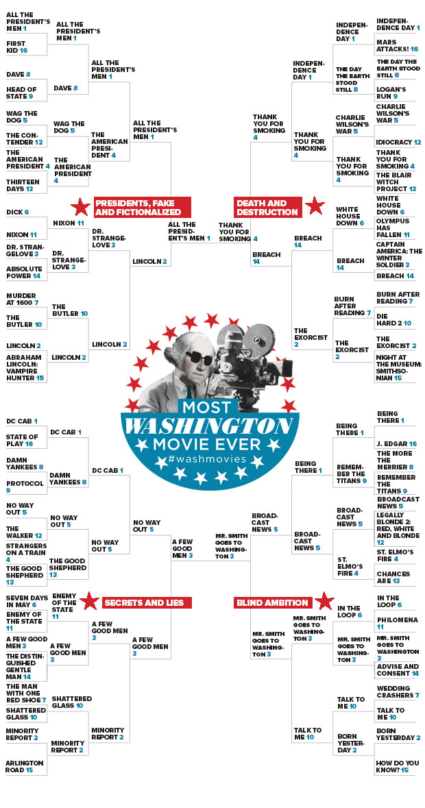 In the Most Washington Movie Ever bracket, All the President’s Men and Mr. Smith Goes to Washington continue to obliterate anything thrown in their paths. Any hope of a DC Cab–Die Hard 2 final died long ago, and now, as we come to the last four movies remaining, a final squaring off between the Woodward-and-Bernstein adaptation and Frank Capra’s anti-infrastructure hooey seems inevitable. These movies might feature highly on any list of great political films, but this project—and this feels like the 15th or 16th reminder—has been a test of these movies’ “Washington-ness.” But perhaps Washingtonian readers really do think “Washington movie” means a celebration of a clueless rube hell-bent on replacing a critical dam-building project that would create thousands of jobs with a campsite for privileged suburban kids to use a few days a year. That’s where this thing seems headed right now.