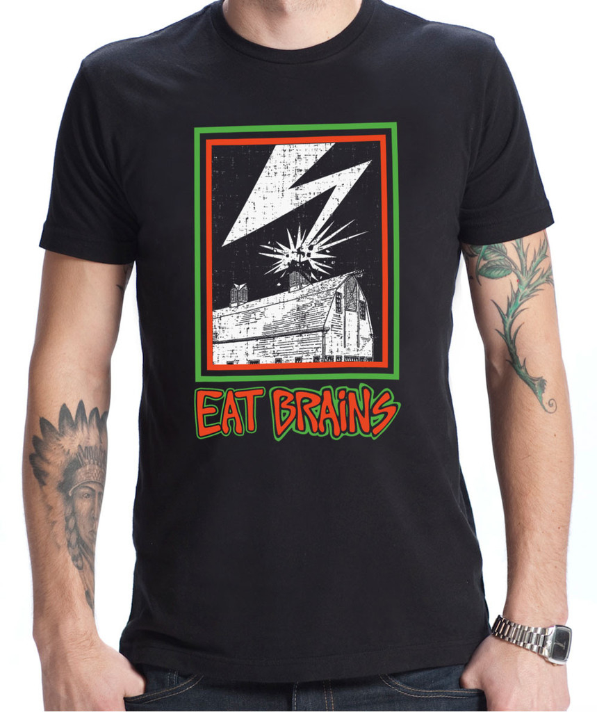 Bissonette’s “Eat Brains” shirt very obviously riffs on the cover art of Bad Brains’s self-titled 1982 debut, swapping out a lightning strike on the Capitol Dome for one on a wooden barn. The shirts sell for $30 from Flavour Gallery, a Los Angeles company that sells food-themed apparel. Besides the “Eat Brains” shirts, Bissonette also designed a shirt inspired by the ska band English Beat.