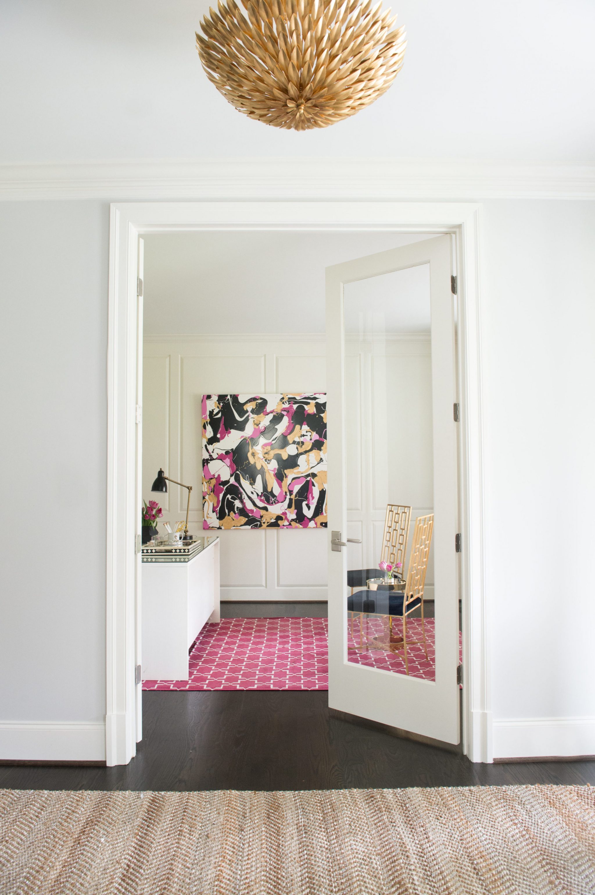 The first step in the quest for fun: That bold fuchsia rug. Singla’s a longtime fan of textile designer Madeline Weinrib, and her graphic Brooke carpet ended up informing the entire room’s look. Since the office is located right off the entrance to the home, Singla wanted to make sure its design worked with the rest of her first floor, which is decorated in a clean, minimalist aesthetic with a touch of glam modernism and a neutral color palette. So she countered the vibrant hue of the rug with airy white walls and furniture, working in hints of gold and black and mirroring the hot pink accent in the room’s artwork.