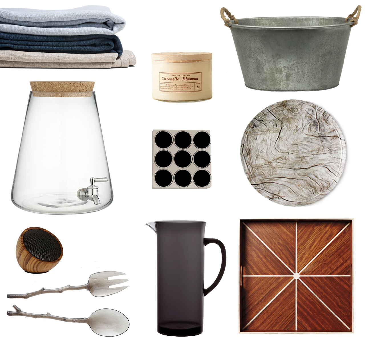 Kaufmann Mercantile linen picnic blanket, $179; Skeem Citronella Blossom Candle, $34; Jayson Home Rope Handle party tub, $85; CB2 glass beverage dispenser, $49.95; H&M paper napkins, $2.95 for pack of 20; West Elm faux bois Naturalist melamine charger, $24.99; Wood bluetooth speaker, $39.99; Twig picnic salad servers, $14; H&M dark gray plastic pitcher, $9.95; Starburst teak tray, starting at $295.