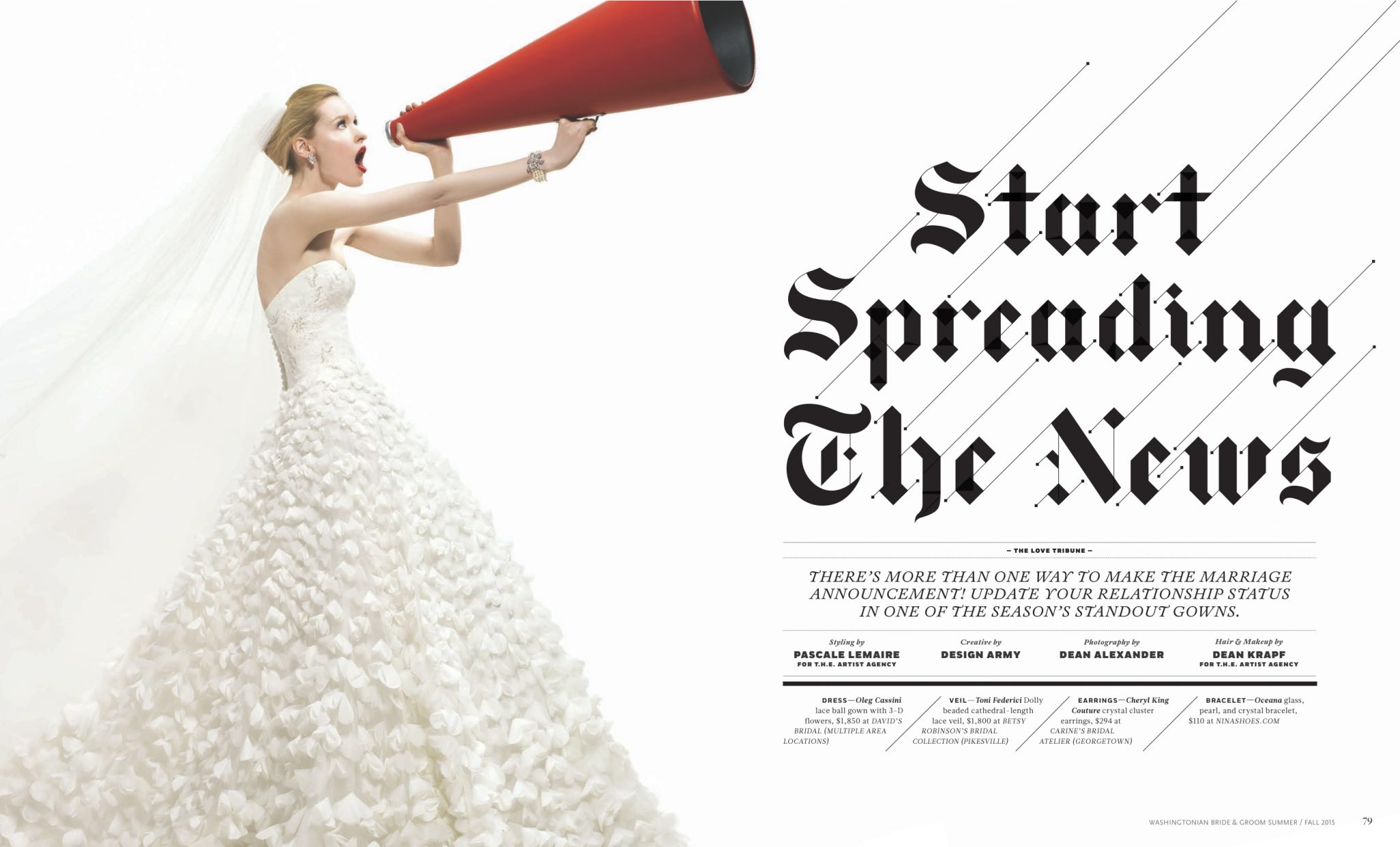 Enjoy some wedding gown inspiration via “Start Spreading the News,” a feature from Washingtonian Bride & Groom’s Summer 2015 issue. There are a million ways to make the announcement of your marriage, and we show all the options in some of this season’s standout dresses.