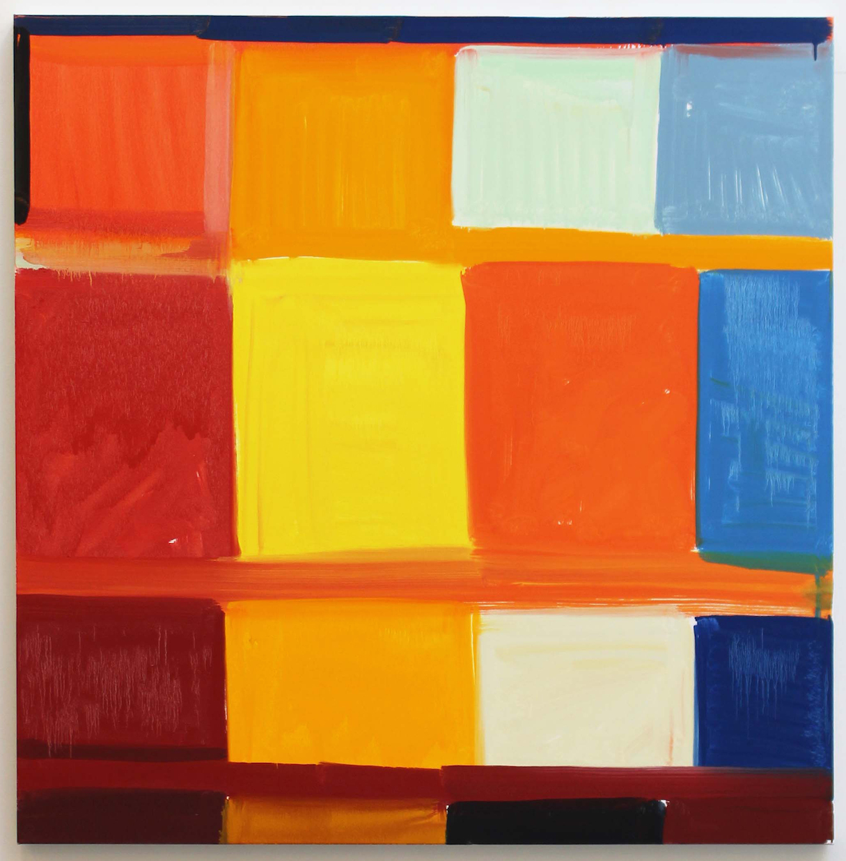 28. It is in the lines separating the rows of these pictures that the absence of white is most conspicuous. In Dance the Orange (2013), the lines are black, light-orange, dark-orange, and red. Not only does that strip of orange alter, say, the way we take in the yellow block in the row above it, and the orange block right next to the yellow block–not only does it heighten the vibrations of the orange-yellow unit–but it also provides no rest for the eye. There is no chance to separate one block from another, or to see them as distinct from one another. There is only color.