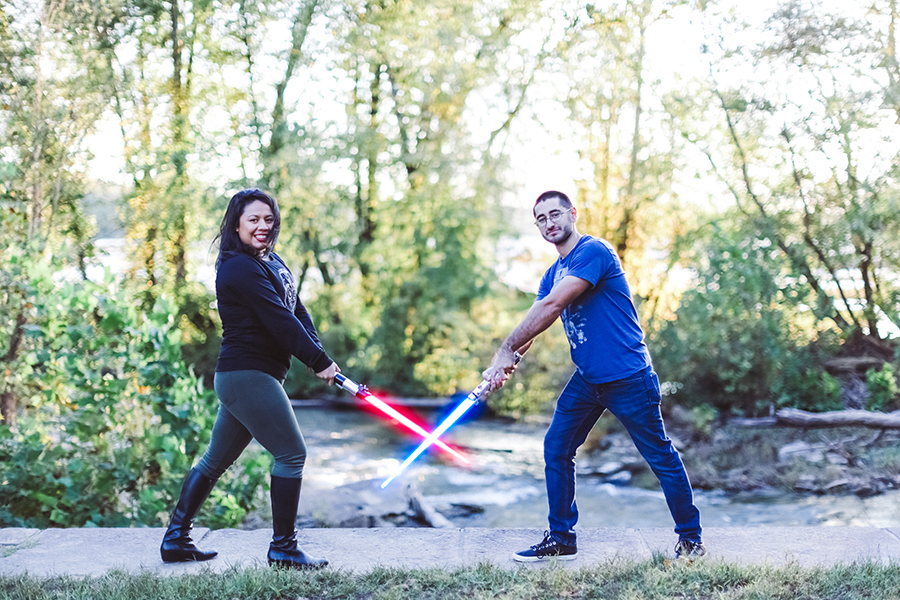 There’s a lot of fun to be had with an engagement shoot. You can stop for ice cream cones, throw paint bombs at each other, play in a huge ball pit . . . or, if you’re Debbie Galo and Edwin Pinto, you can have a lightsaber fight. These high school sweethearts paired up with Din + Cal at Rocklands Farm for a Star Wars-themed engagement shoot, and the results are equal part adorable and awesome.