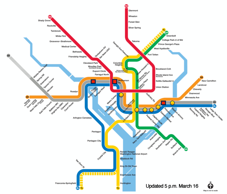 The bulk of the damage was found in the Blue, Orange, and Silver trunk that runs beneath downtown DC, according to a map Metro presented at a press conference yesterday. The most severe damage was found at Foggy Bottom, McPherson Square, and Potomac Avenue.