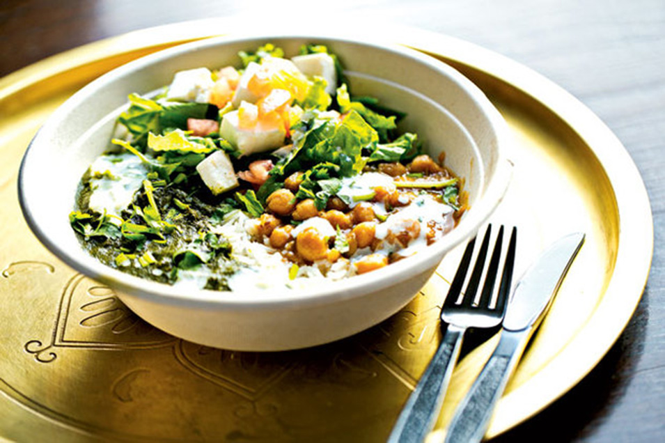 Also good: Vegetarian bowl with chickpeas, brown rice, and either korma or spinach gravy.