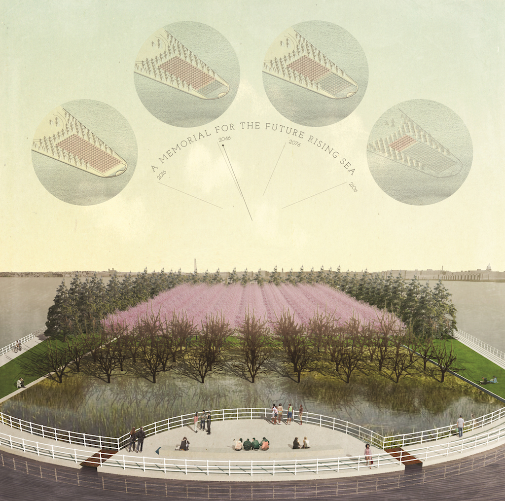 “Climate Chronograph,” the proposed memorial to the effects of unmitigated climate change, proposes planting rows of cherry trees at the tip of Hains Point to act as a “living observatory for an unfolding global story.” Over the the years—think at least a century—if sea levels continue to rise, more of Hains Point becomes submerged and the trees die. This is not that hyperbolic: Hains Point is one of the most vulnerable spots in DC, according to projections of the effects of rising sea levels.