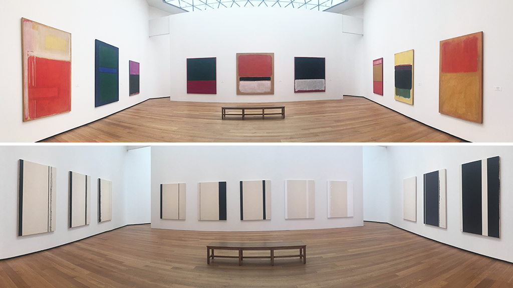 The light edging around either side of the room’s division invite the viewer to move from Newman’s chiaroscuric works, which require you to move from painting to painting searching for the scene in each, to a mirror image of that space covered in Mark Rothko’s giant, glowing canvases, which require the viewer to step back and attempt to take in the sight of so much hazy, vivid color all at once. The dichotomy is stark, and yet the paintings all work together somehow, rather than one set repelling the other.