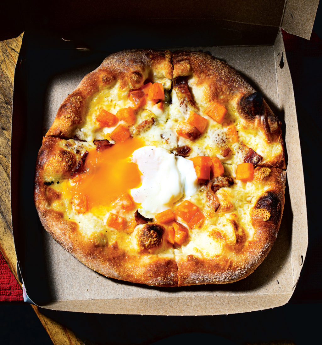 —The secret to runny yolks? Organic eggs from Farm at Sunnyside are slow-cooked in a sous-vide machine, then cracked atop the pies to order.