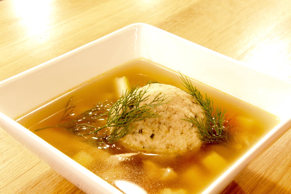 Not everything on the menu is meant to be indulgent. Fishman offers healthier riffs on traditional recipes, such as oven-roasted vegetable latkes with lemon-yoghurt sauce alongside the traditional fried potato. The menu also includes a variety of meatless sandwiches and salads. And, of course, matzo ball soup.