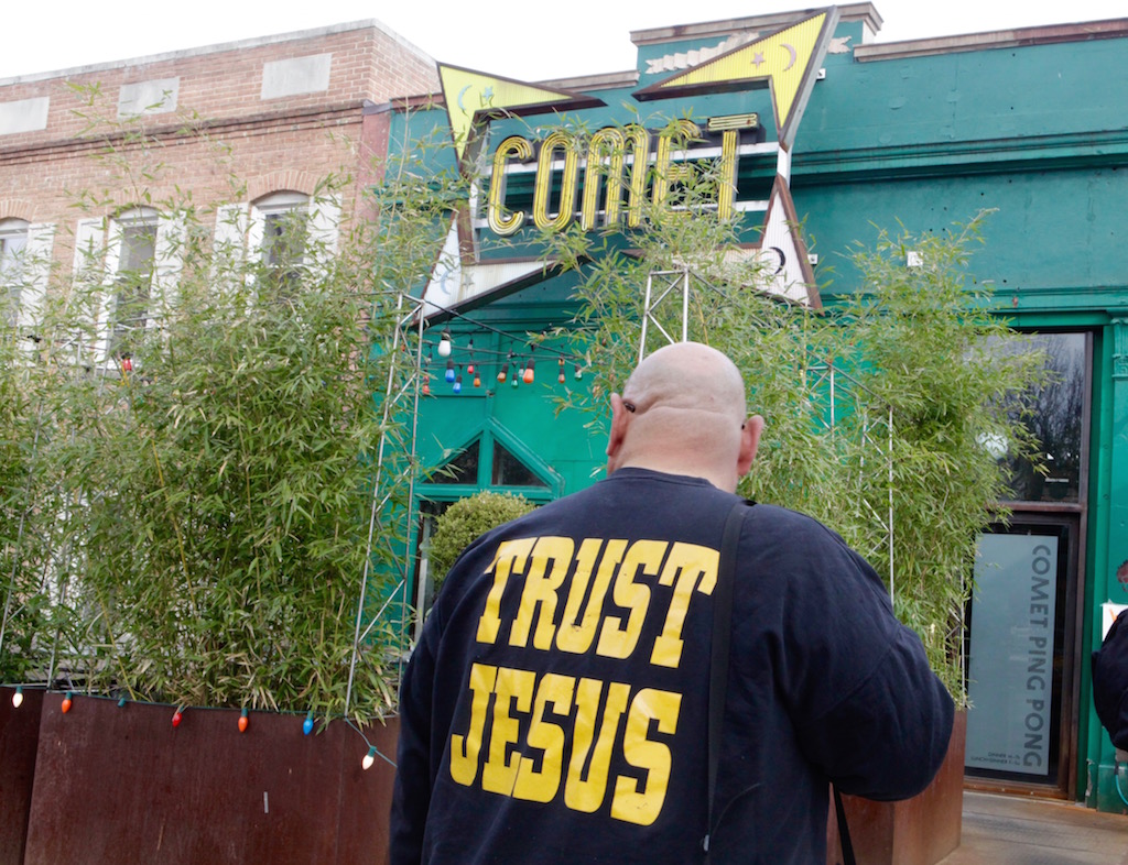 Here’s a fun one that suggests crossover between these protesters and the Pizzagate “theorists”: “Tell me why this pizza place isn’t even open at noon,” the demonstrator rants, before arguing that President Obama is a Muslim.