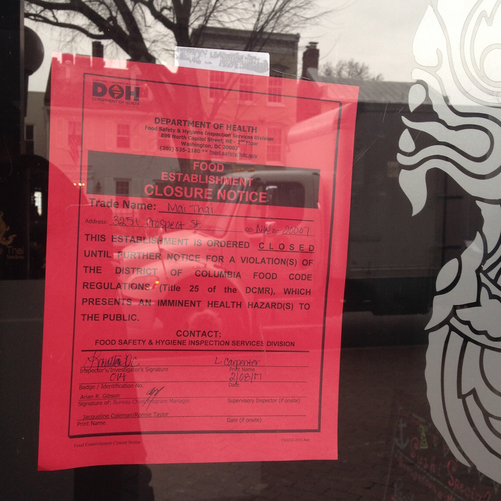 Mai Thai in Georgetown has been closed by the DC Department of Health. A sign on the door indicates that the Thai restaurant and sushi bar at 3251 Prospect Street, Northwest, was ordered closed on February 8 for food code violations “which presents an imminent health hazard(s) to the public.”