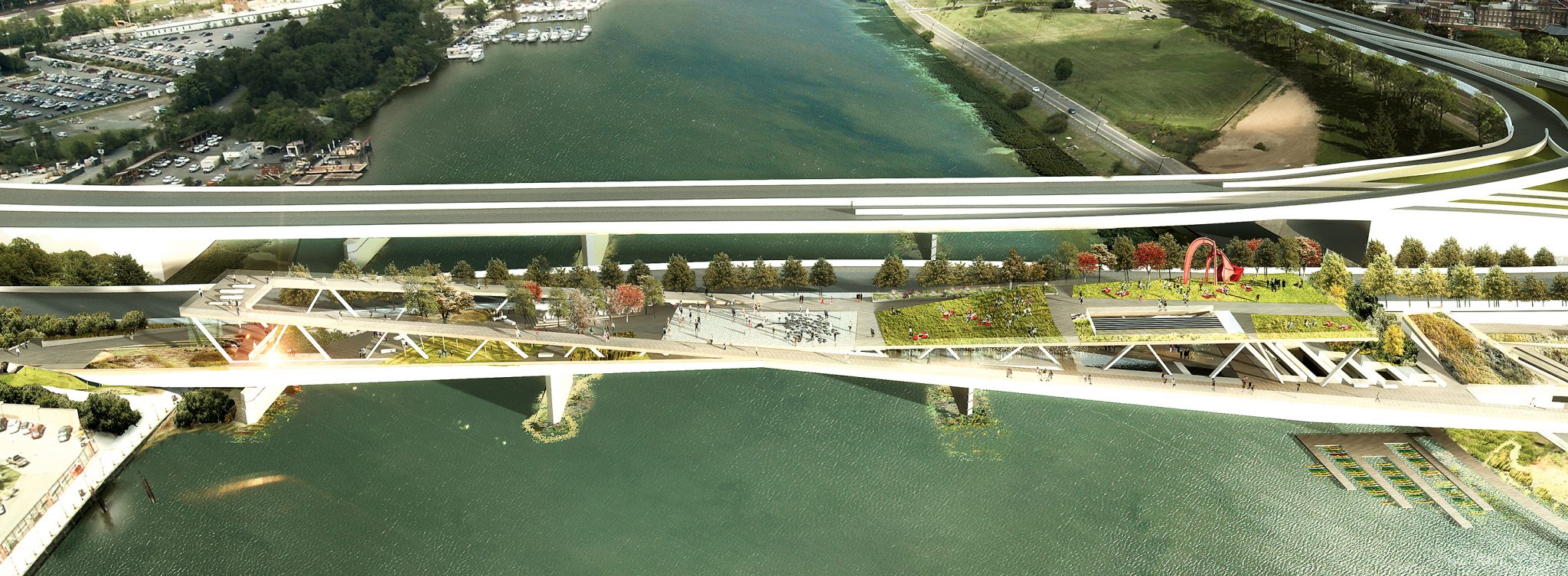 The actual design of the Bridge Park, created by the Office for Metropolitan Architecture (OMA) and the landscape-architecture firm Olin Studio, is meant to encourage social and economic equality, too.