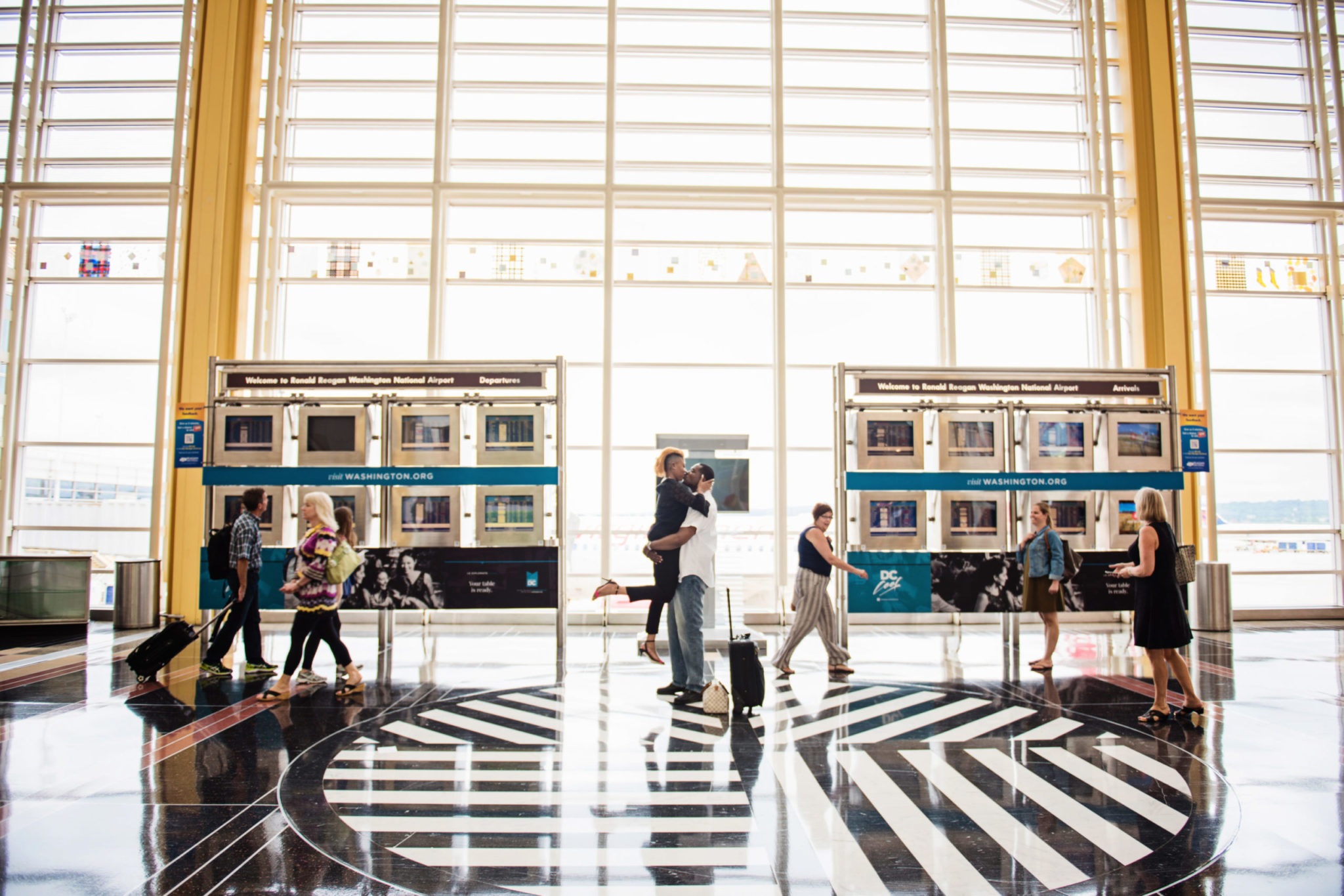 Derrick and Myeshia dated for three years before they became engaged on a wintery Christmas morning next to their tree at their shared home in Fairfax. Since the couple met in DC, they wanted to convey their love of the city—and travel—in their engagement shoot. They worked with photographer Kathleen Hertel of Love and Adventure Photo for a photoshoot that hit all of their favorite spots in the city, then wound up at Ronald Reagan National Airport (considered by some to be DC’s prettiest airport) where they rolled prop suitcases and took advantage of the buildings airy backdrop to grab some amazing shots.