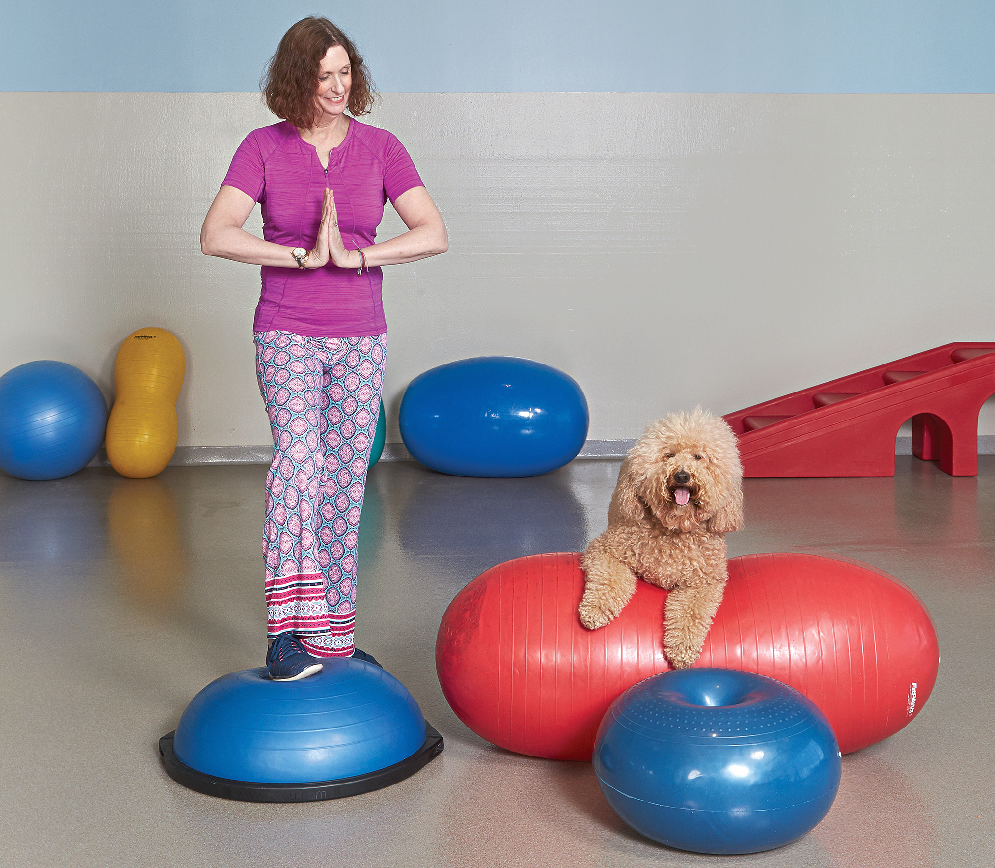 I change into workout gear and meet Georgie Girl in the second-floor Day Camp Room, a sun-filled studio with all kinds of primary-color exercise balls. Georgie, a goldendoodle owned by Sedwick, has the core strength of an elite athlete, easily balancing herself on her ball while I struggle to maintain a one-legged stance on mine. She’s getting a steady stream of treats from our instructor, a tall, ponytailed guy whose ability to appear silently out of nowhere strikes me as more catlike.