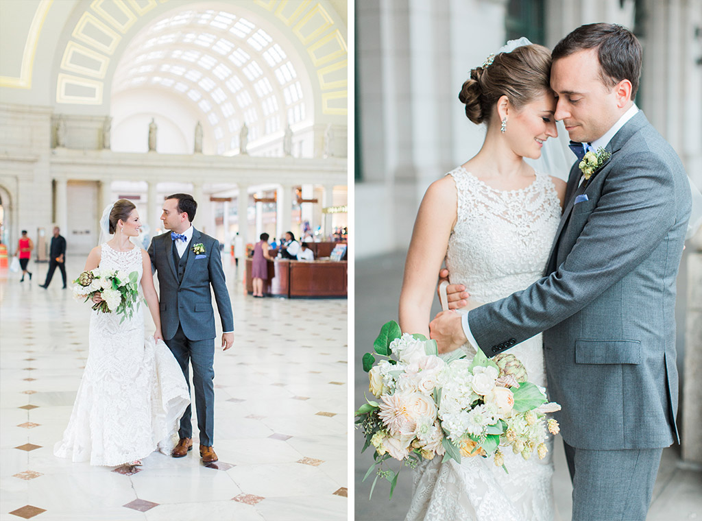 Photographer: Abby Grace Photography | Event Coordinator: Kruse & Vieira Events | Venue: Union Station | Florist: Petal and Print | Rentals: White Glove Rentals and DC Rental | Bride’s Gown: BHLDN | Hair & Makeup: Up Do’s for I Do’s | Groom’s Attire: J. Crew and Knotty Tie Co. | Music: String Poets and White Ford Bronco | Catering and Cakes: Design Cuisine | Stationery: Bellajenna | Transportation: Limousines, Inc. and DC Pedicab | Signs: Kruse and Vieira Events