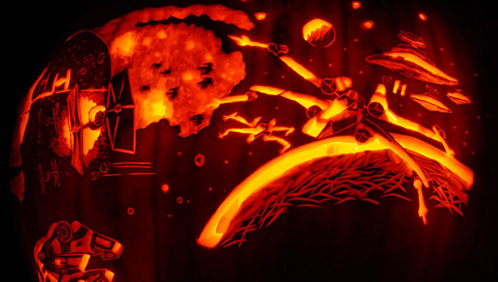 Finding the right pumpkin for the right project can be difficult work. “If I’m going to carve the Death Star, I want something that’s very rounded,” he says. “If I’m going to carve a Star Wars battle scene, I want a nice, flat, widescreen look.”