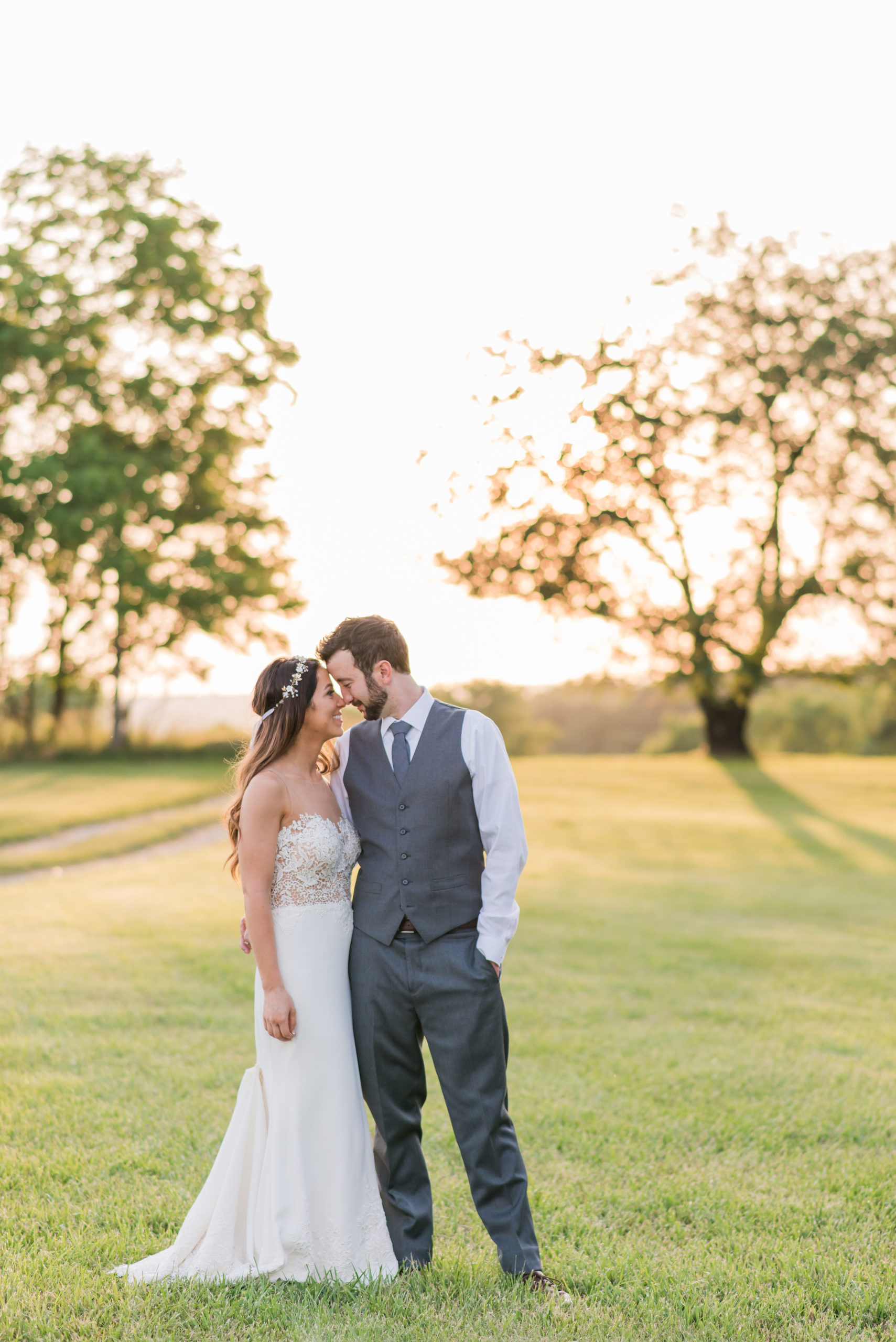 On their wedding day, Dreux traded her cheer uniform for a Martina Liana gown and a sweet, beaded flower crown. Patrick chose a classic light-grey suit and tie for himself. And their bridesmaids and groomsmen wore floor-length Champagne-colored dresses, and dark-grey vests and bowties, respectively. Photographs by Marlayna Photography.
