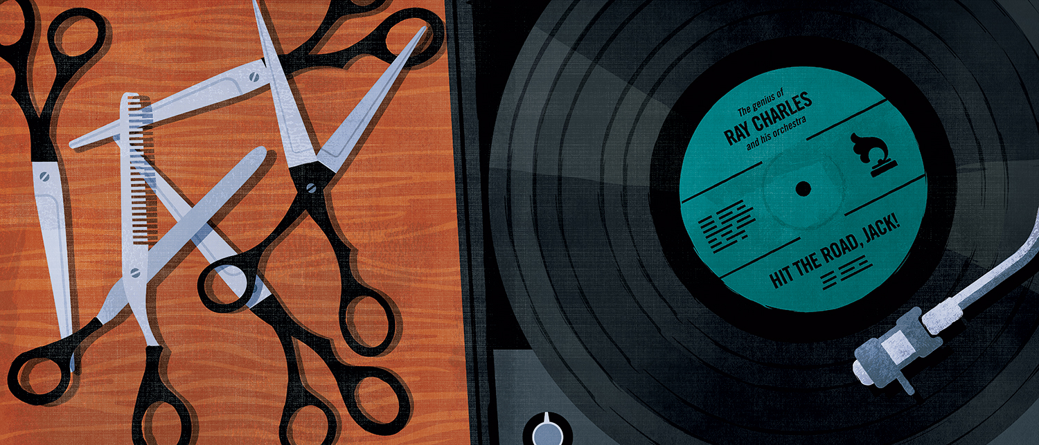 Jenkins opens the credenza lid and picks up the tone arm, sets it on a record. The opening strains of Ray Charles’s “Hit the Road Jack” fills the shop. Sitting in his chair, Jenkins looks slyly to where Hubble is playing two-handed tonk with A.B., their chairs pulled away from the wall to face each other.