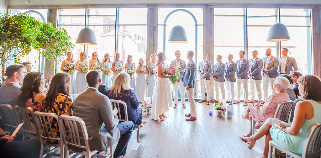 For their eclectic wedding, Ella Claney and William Cooper needed a location for a “super-fun dance party” wedding with enough tradition to please their parents. They chose Roofers Union in Adams Morgan, where they could do everything on-site. “Having multiple levels was key,” says Ella. “We held the ceremony in the dining room”—Ella’s brother officiated—“and then moved to the roof for drinks and appetizers while they flipped the room for the standing reception.”