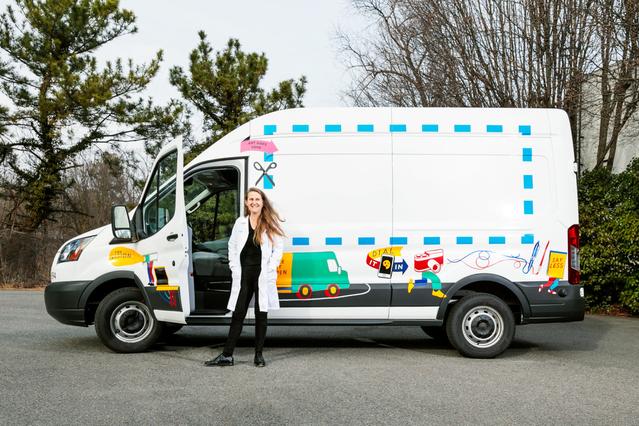 Connolly is now the special projects curator for Arlington’s Cultural Affairs division. She’s wearing a white lab coat and standing by the Arlington Art Truck, a moving art exhibition that’s set to make its way around the county until October of this year. It was hand-painted by New York artist Stephen Powers, and meant to pop out against the neutral tones she typically sees around town.
