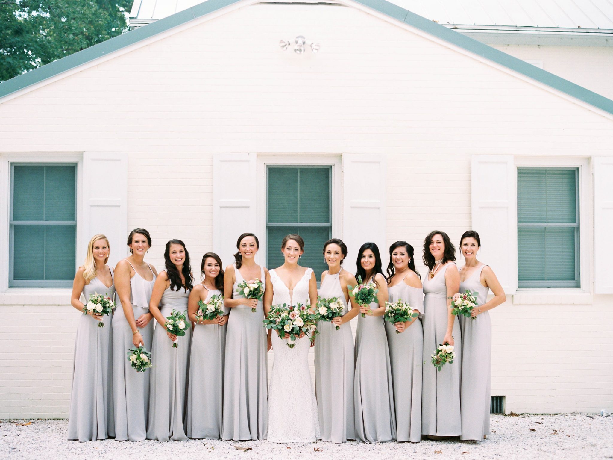 The intimate, late-summer, “earthy and elegant” wedding included a soft, rustic take on a nautically inspired palette with navy blue suits for the groom and groomsmen, pale mauve dresses for the bridesmaids, and cream-colored linens topped with ivory and dusty rose florals, lots of greenery in eucalyptus, blackberry foliage, jasmine and vine, and both olive and brushed gold accents. At the ceremony, hung at the end of each row of chairs was a small cone of confetti for guests to toss in celebration as the newlyweds exited back down the aisle.