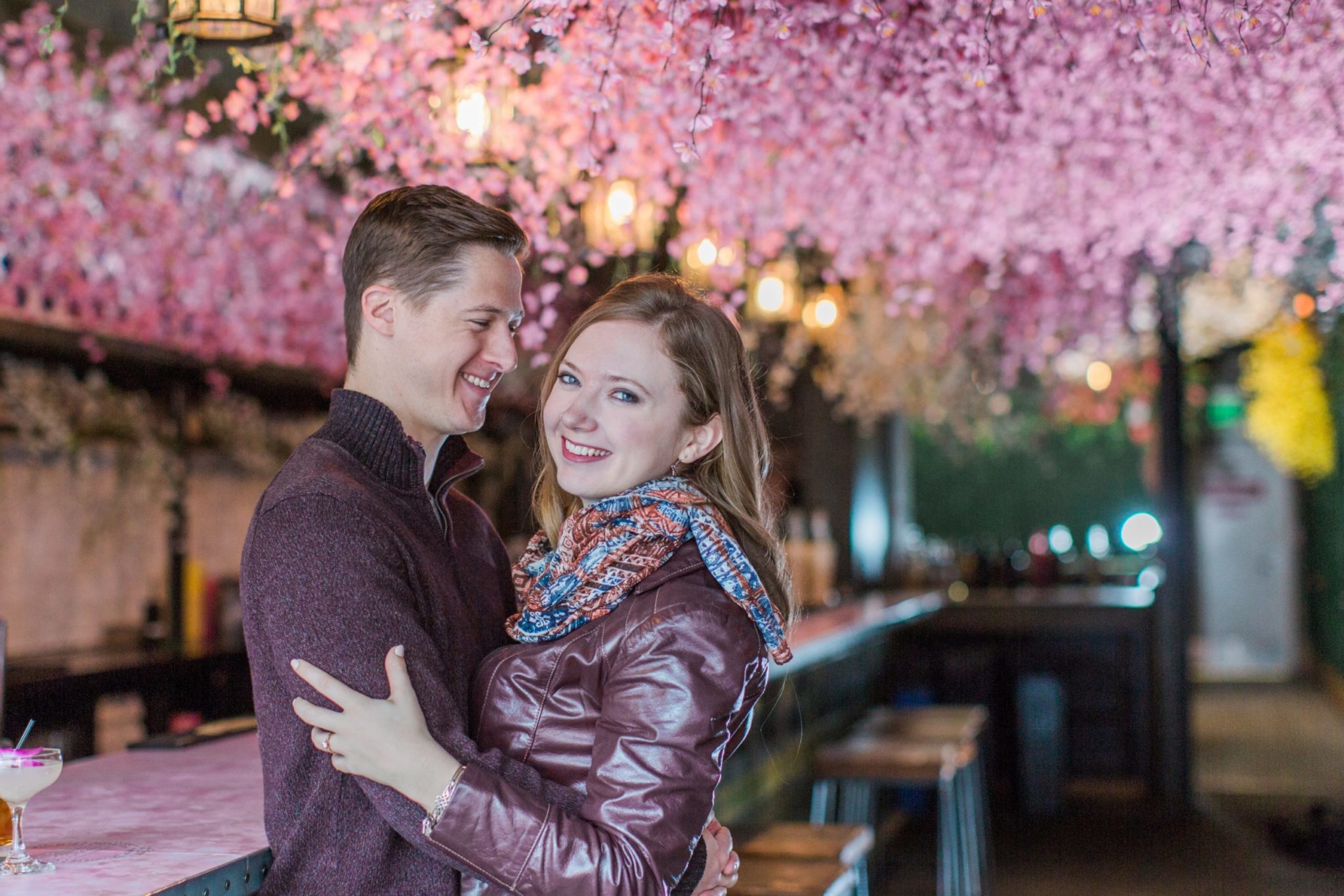 “The cherry blossom pop-up bar was, first of all, something we’d really wanted to go to anyways, we’d even tried to go last year, but the line was too long,” recalls Annie, “I looked at pictures and was like, ‘wow, this is beautiful… maybe they would let us do our engagement shoot there.’”