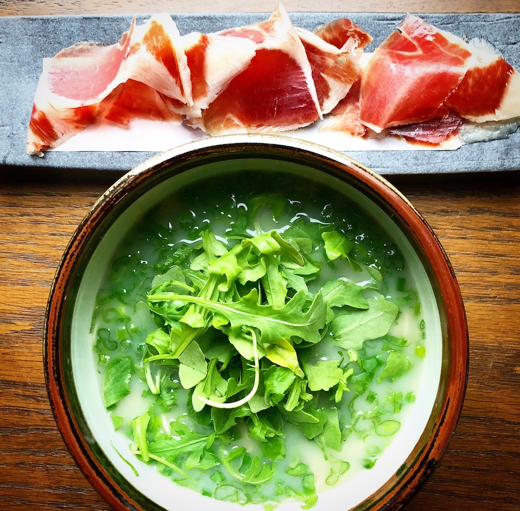 “It dramatically changes the flavor [of the ramen] in a very, very good way,” says Smookler, who tops the bowls with cured jamon Ibérico, green onion, and peppery arugula. Iberico de Bellota (the caviar of Spanish hams) can be hand-carved at the table for an additional fee.