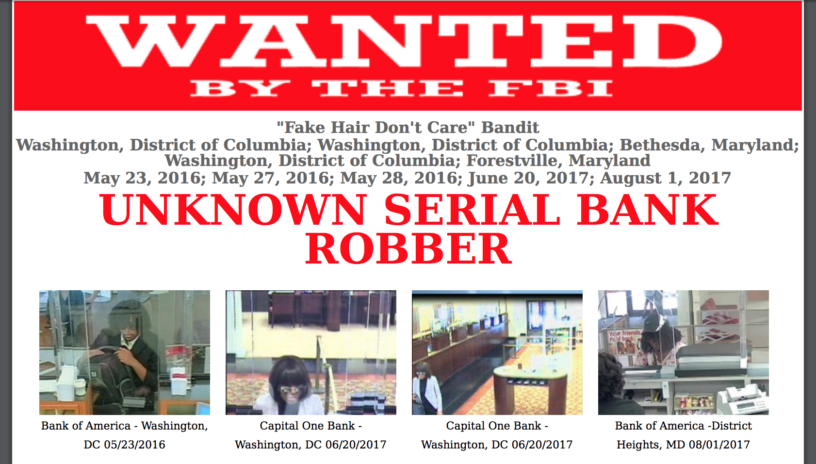 On Tuesday, the FBI offered a $10,000 reward for a woman who robbed five different banks across Northwest DC and Maryland from May 2016 to August 2017. Her real name? Unknown. Her nickname? Unforgettable: The “Fake Hair Don’t Care Bandit.”