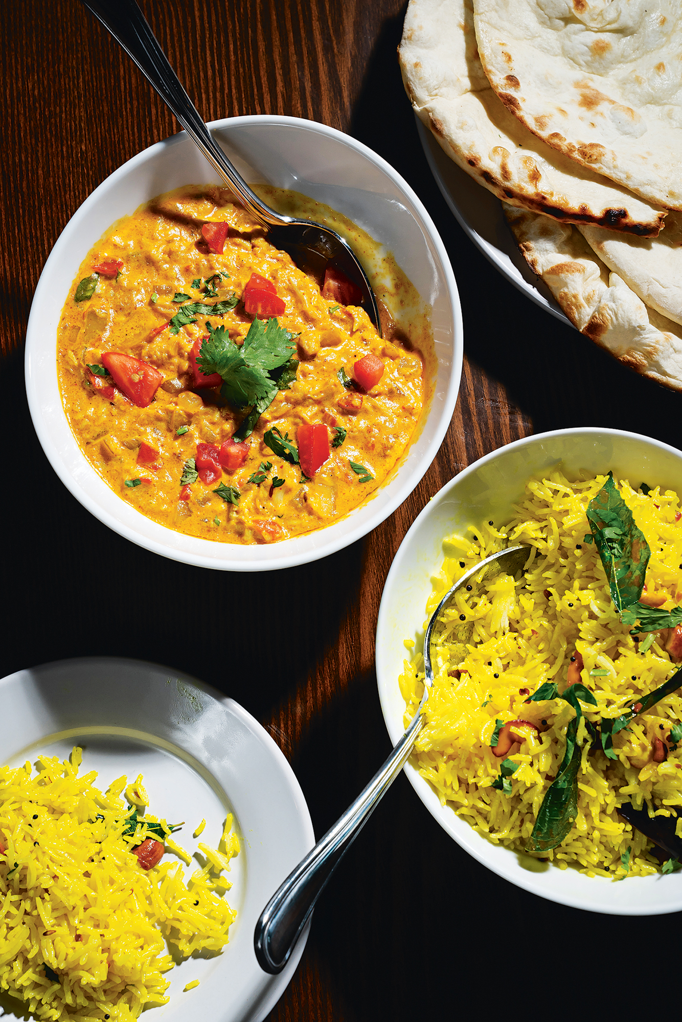 You’ll likely be plenty full—this food isn’t shy on cream or ghee or coconut milk (the rice is studded with cumin seeds to help digestion), and portions are generous. Still, consider one of the desserts that Venkatesan sees as his specialty, whether a mango kulfi or rasmalai, a milky pudding scented with green cardamom.