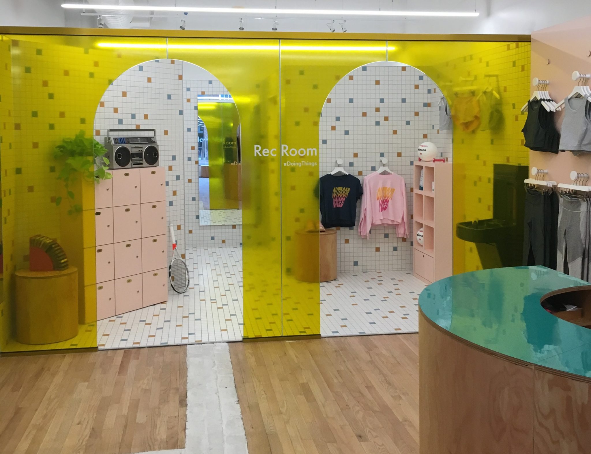 The highlight of the Georgetown location is the brand’s first-ever Rec Room. The tiled nook in the back of the store is meant to feel like an old-school YMCA, says Rubenstein, and will allow anyone to borrow gear such as tennis rackets, soccer balls, basketballs, and roller skates—for free (this kind of access is important when getting people to do things). Anyone can walk in off the street, borrow some skates, lock their keys in a pink locker, fill up their water bottle, and scoot off to navigate the maze of students and tourists on M Street. Haney chose Georgetown because of just this kind of “inherent energy,” she writes in an email. “From the students down the street at Georgetown University browsing shops in between classes to the rowing clubs on the Potomac River practicing in the evenings, Georgetown brings people together, just like us.”