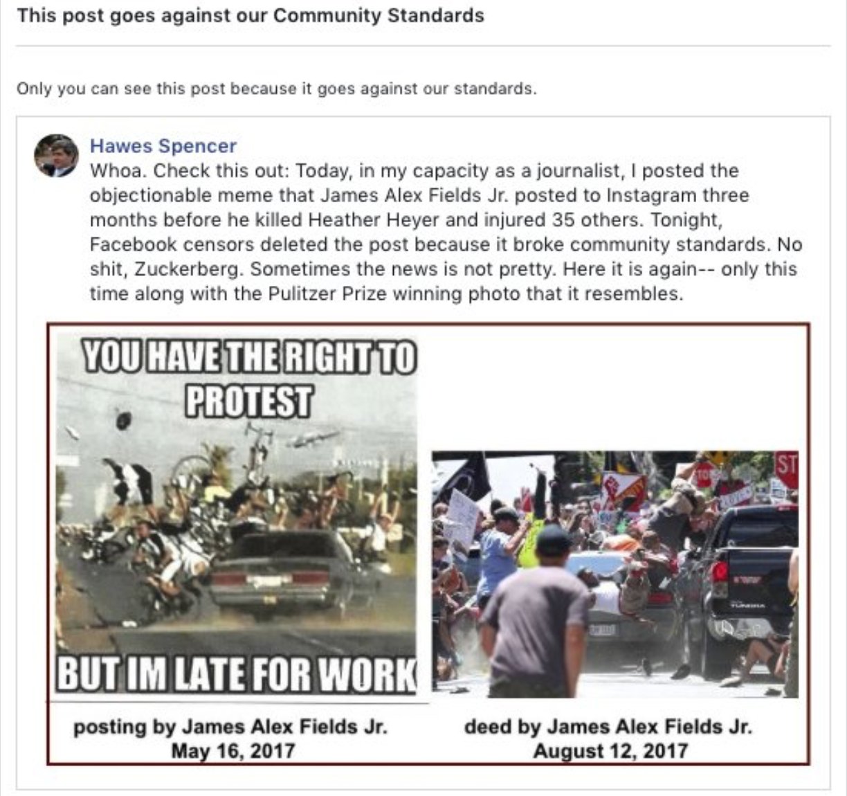 Later that evening, though, his personal post had vanished from his page, and Spencer noticed he’d been logged out of his Facebook account on his desktop computer at home as well. He signed back in and saw a note saying his post violated community standards. He reposted Fields’s meme, this time alongside Ryan Kelly’s Pulitzer Prize-winning photo of the incident. “Today, in my capacity as a journalist, I posted the objectionable meme that James Alex Fields Jr. posted to Instagram three months before he killed Heather Heyer and injured 35 others,” he wrote in the post. “Tonight, Facebook censors deleted the post because it broke community standards. No shit, Zuckerberg. Sometimes the news is not pretty.”