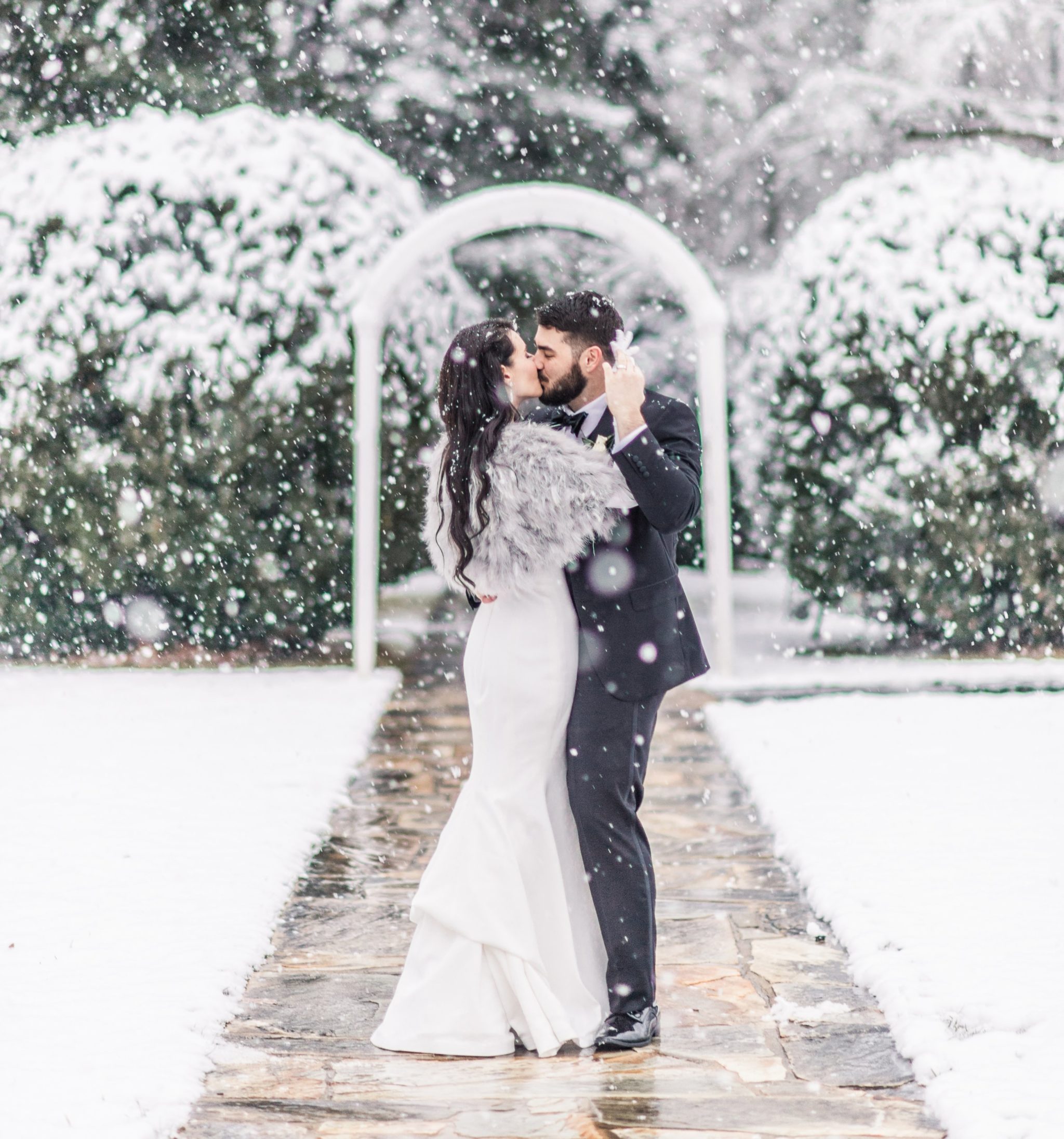 The bride’s favorite part of the wedding? The snow! Though they also loved the intricately-designed floral staircase by J. Morris Flowers. “It was breath-taking” the couple recalls, “the band was playing from the stairway landing as if it was a stage.”