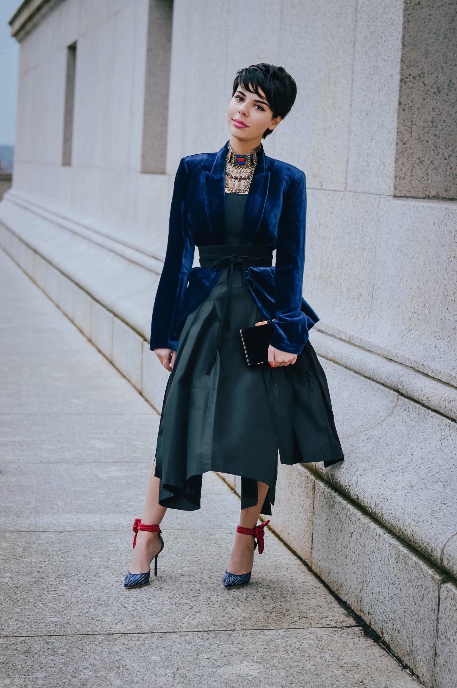 “My Blazer is by L’agence, skirt is by Phillip Lim, shoes by Malone Souliers x Emanuel Ungaro, clutch by Zara, and I have completed the look with my vintage Afghan choker. All purchased from various online retailers.”