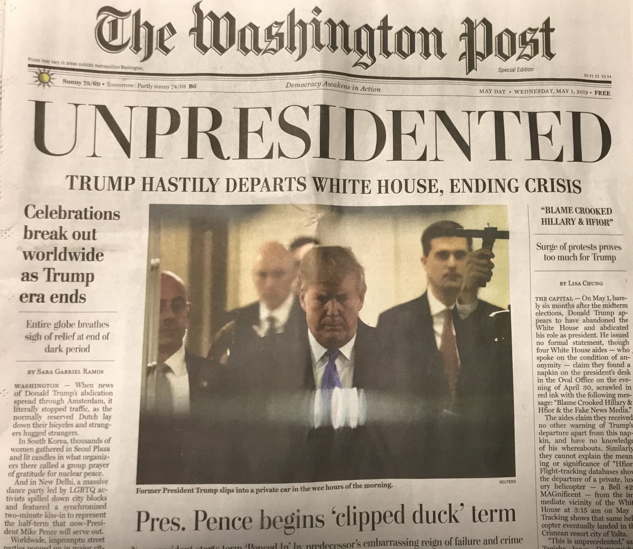 A remarkably detailed parody of the Washington Post is being handed out near the White House Wednesday morning. It features a banner headline screaming “UNPRESIDENTED” and is dated May 1, 2019. It purports to chronicle President Trump’s last day in office. In a story datelined “THE CAPITAL,” it says Trump left the White House suddenly, leaving only a napkin with the words “Blame Crooked Hillary & Hfior & the Fake News Media.”