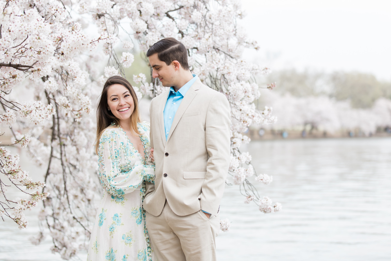 For their engagement photos, the couple once again went with a dreamy setting—this time closer to home. They waited until early spring in the District to capture the ethereal landscape so popular with visitors and locals alike—the cherry blossoms in full bloom. The shoot was held along the Tidal Basin, framed with the Jefferson Memorial and the peak blooms of cherry blossom season. The couple opted to pair their backdrop with clothing that bore subtle pops of color in order to highlight the simple beauty of these shots. The now-married couple brought similar elements to their springtime wedding at a renovated Virginia barn in Leesburg on April 15, 2018.