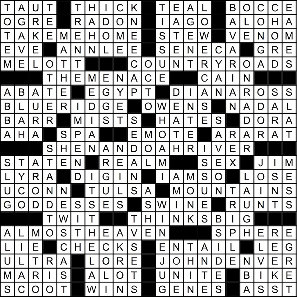 120. Singer of a famous song about West Virginia; its lyrics provided this puzzle’s starred theme entries