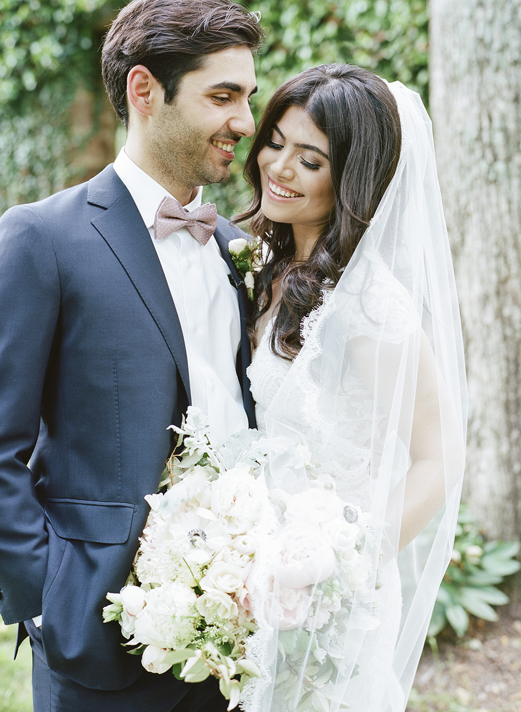 The pair chose the Goodstone Inn for its idyllic setting, which reminded them of the German countryside, and an ivy wall that charmed as the backdrop for their spiritual ceremony. The reception tent was strung with chandeliers as a nod to Daniel’s proposal, and brass votives, bronze vases, and flowing flower arrangements complemented the pastel color scheme. The couple served signature mocktails: a “Strawberry Feels Forever” fizz and a “Mint to Be” mojito twist. Though rain threatened the outdoor ceremony, Kimiya says, they didn’t care. “We’d waited so long for this union, and nothing, not even weather, could prevent it from happening.” The newlyweds honeymooned in Miami, relaxing by the pool and restaurant-hopping.