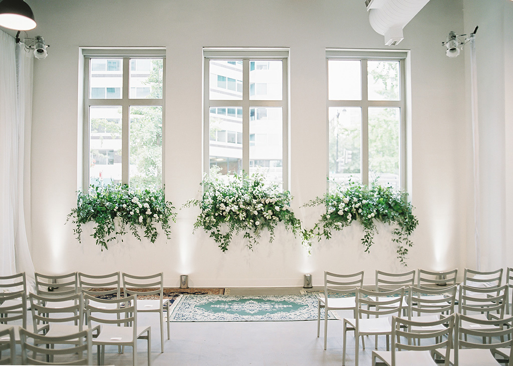 Megan pored over the details of their big day, giving particular attention to the stationery elements, from the handmade kozo-paper-lined invitations by Fig. 2 Design to the menus. They kept the ceremony short and skipped the family dances and garter toss. White flowers with green foliage arranged by Holly Heider Chapple Flowers perfectly complemented what Megan describes as the event’s “modern, organic” feel. At the reception, guests found their seats according to slate place cards designed by their planner and calligraphed by Jessica McSweeney. Instead of a drink menu, guests ordered beverages from ingredient options printed on cocktail napkins at the mixology bar, and instead of cake, Oreo gems and coffee were served tableside along with treats from a Milk Cult ice-cream bike.