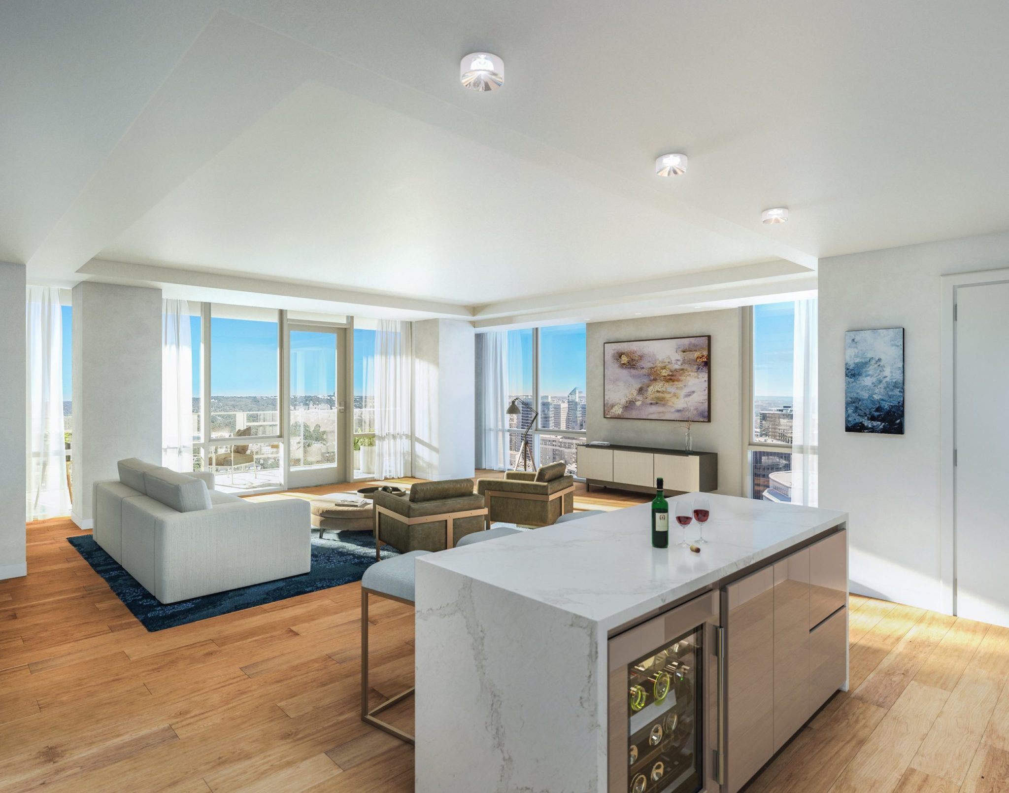 The developer released new renderings, as well as a virtual tour of the Pierce condos this week, depicting the 27-story building’s communal amenities and modern finishes. The condos will range from one- to three-bedrooms, and residents will have access to a rooftop terrace, two-story gym, a club room, and a “hotel-style” lobby. The condo owners will also be able to use the rooftop pool at the Evo apartments.