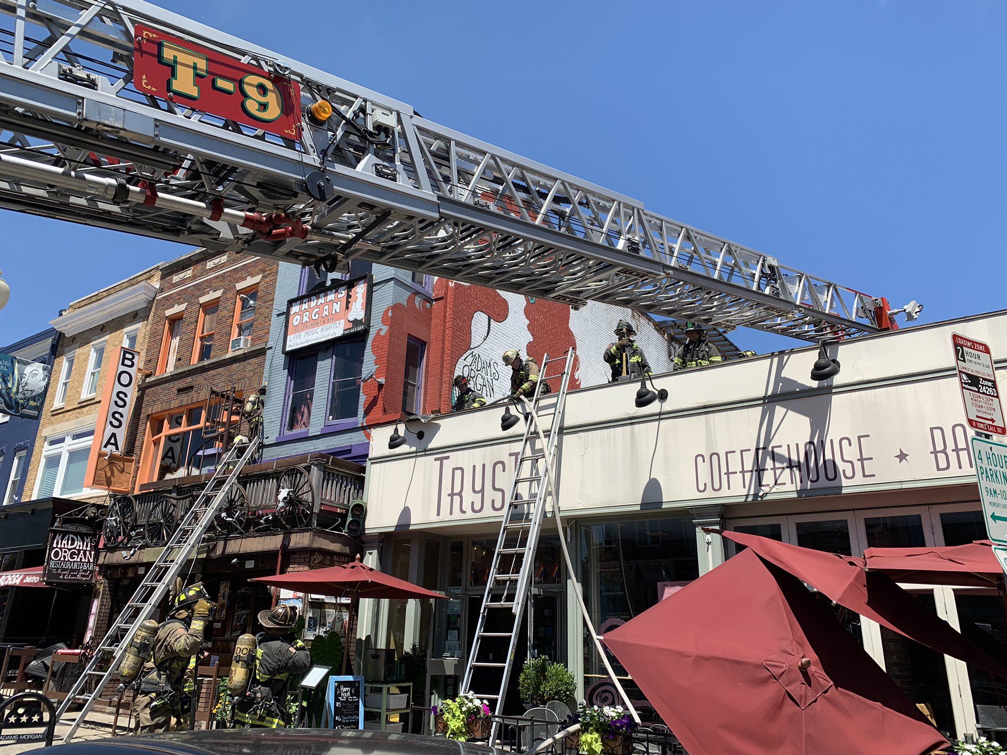 A small fire broke out on the roof of Adams Morgan coffeehouse Tryst today. A quick-thinking employee of Madam’s Organ next door grabbed one of their fire extinguishers and attacked the fire from the second-floor balcony until firefighters were able to arrive and completely put it out.