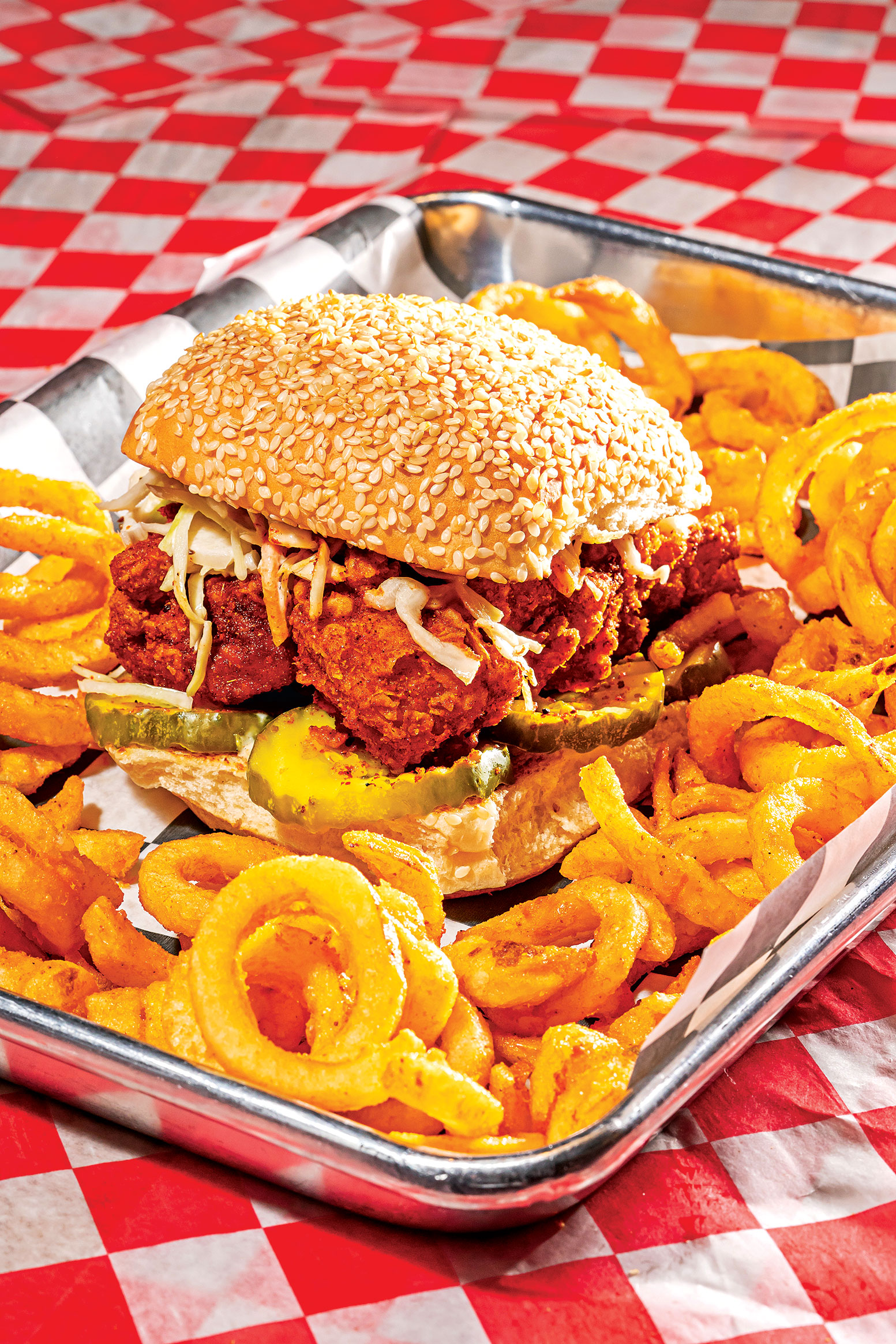 The word is out about this tucked-away, weekday-only hot-chicken spot—and Facebook foodie groups aren’t the only ones going nuts for it. On a Tuesday at 1:30, the line was still winding back to the front door, the air tingly with cayenne. The sandwiches are great—even if, like us, you make it to only the second spice level out of the six you can choose from. (Brave the two hottest and you’ll have to sign a waiver.) Even with the vinegary slaw and pickles, creamy sauce, and buttery bun, our mouth stayed on fire for hours. Sides of sweet-potato fries and fried okra are a good buffer.