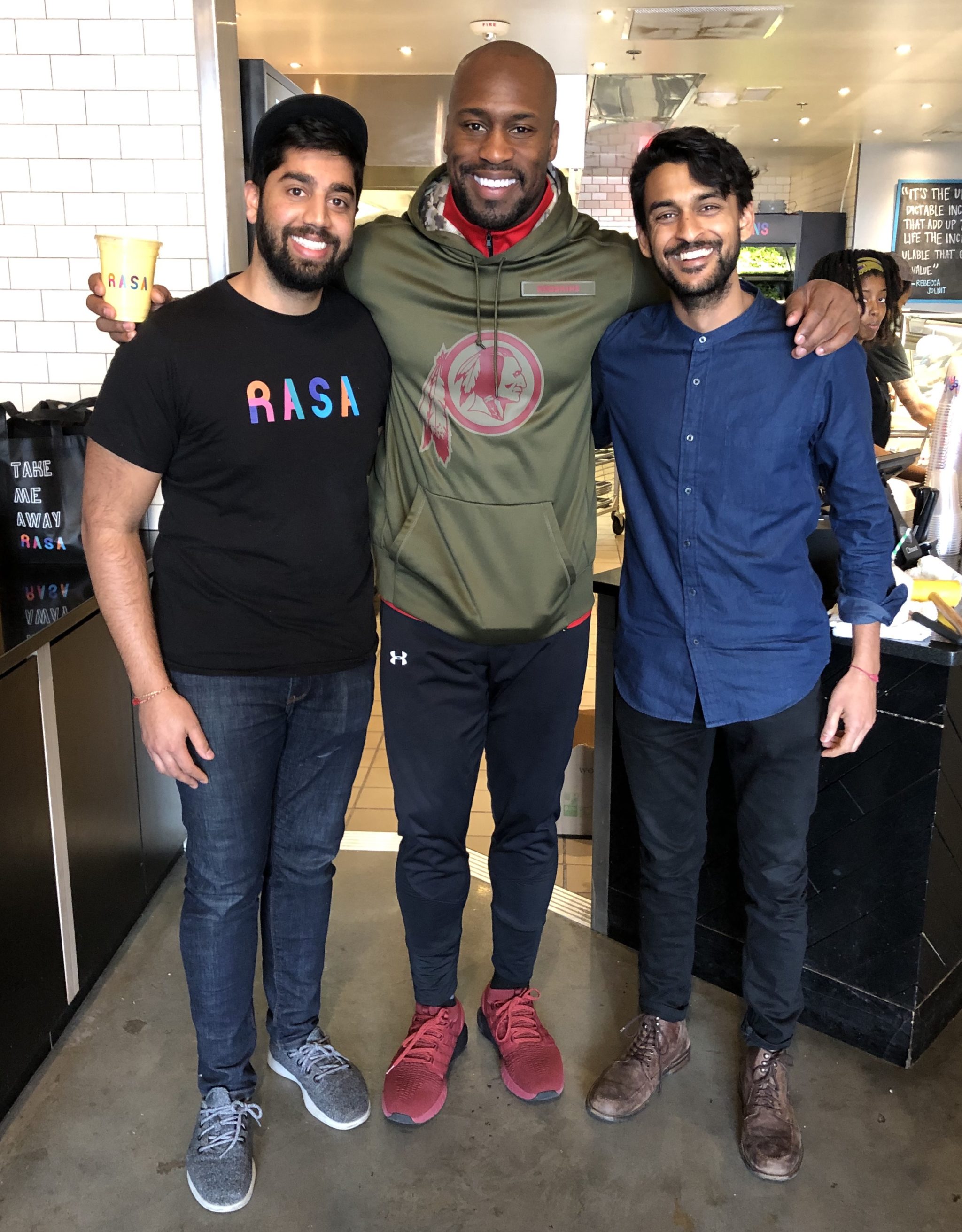 Where they are today with their efforts to make Indian-food-for-all is telling. Two new “fine fast-casual” Rasa locations will open soon: one in Mt. Vernon Triangle’s City Vista development this winter, and the other in National Landing in connection with Amazon’s HQ2 headquarters next spring. Big-name developers are on board (Edens for DC, JBG Smith for Virginia). And even bigger-name athletes have joined the team. Redskins star and about-town philanthropist Vernon Davis just signed on as a “significant investor” and Rasa brand ambassador. Like the young restaurateurs, Davis is a University of Maryland grad and was introduced through a mutual friend.