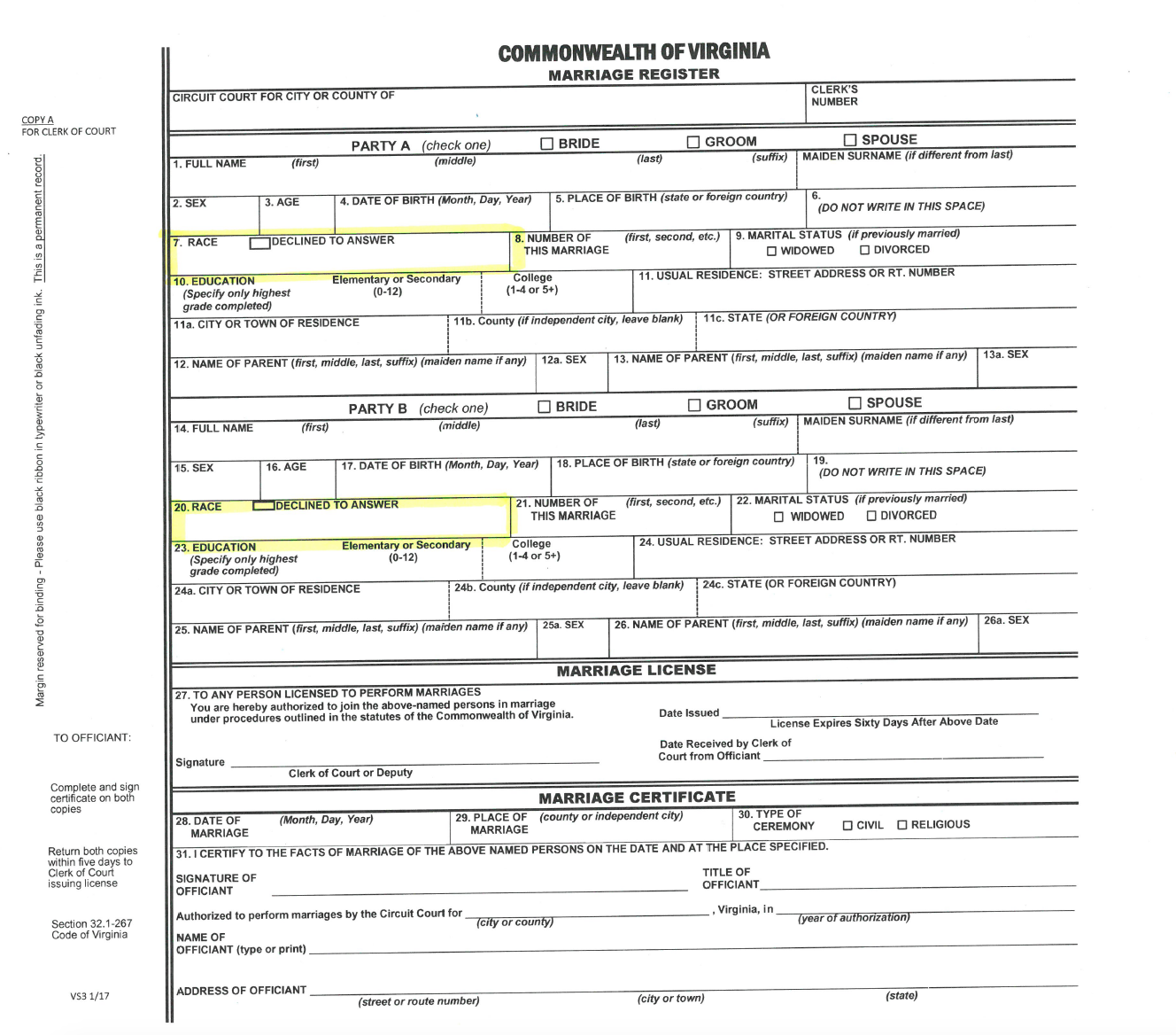 Virginia Attorney General Mark Herring said in a statement Friday that couples applying for marriage licenses no longer have to list their race on state forms, the Richmond Times-Dispatch reported. The news comes after three Virginia couples who refused to provide their race were denied licenses, then sued Virginia on September 5 to challenge the constitutionality of the “records of marriages” law.