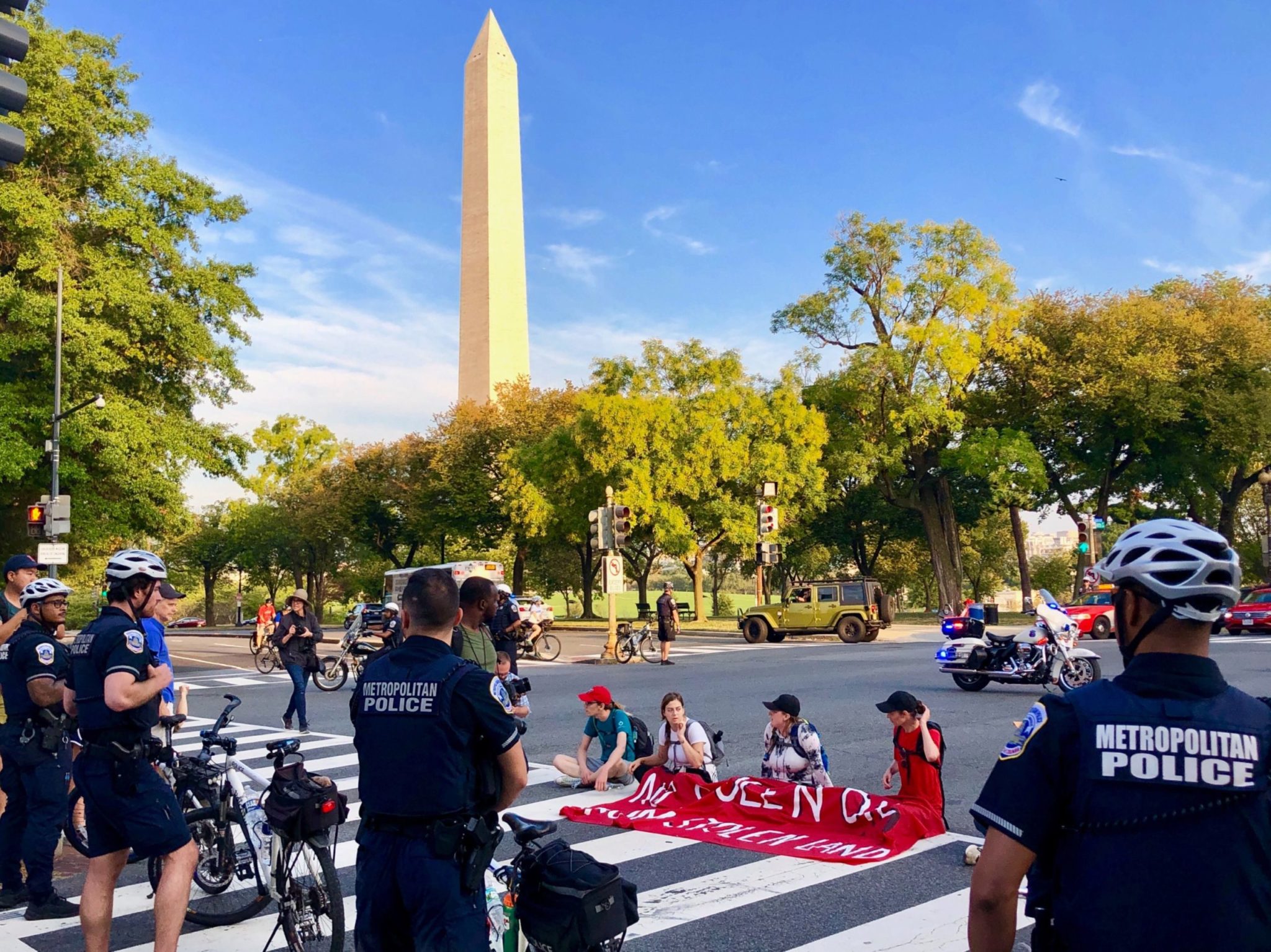 Activists rallied across the city. A group of interfaith protestors processed slowly down major streets. Healthcare workers held blood and glucose screenings. A group called Extinction Rebellion brought a big yellow-and-pink sailboat to 16th and K streets, Northwest, covering protestors with fire retardant cloth so they wouldn’t be injured when police sawed off the chains connecting them to the boat.
