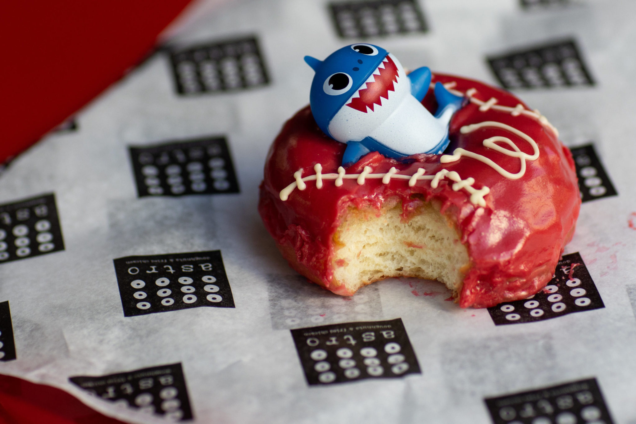 Astro Doughnuts & Fried Chicken (1306 G St., NW) debuts baseball doughnuts for fans, cloaking a vanilla doughnut with raspberry glaze and white chocolate lacing. A collectable baby shark takes center stage (if you need a baby shark explanation for the Nats, see here). The doughnuts are available on game days for $3.95 each. Note: the G Street location is now sold out.