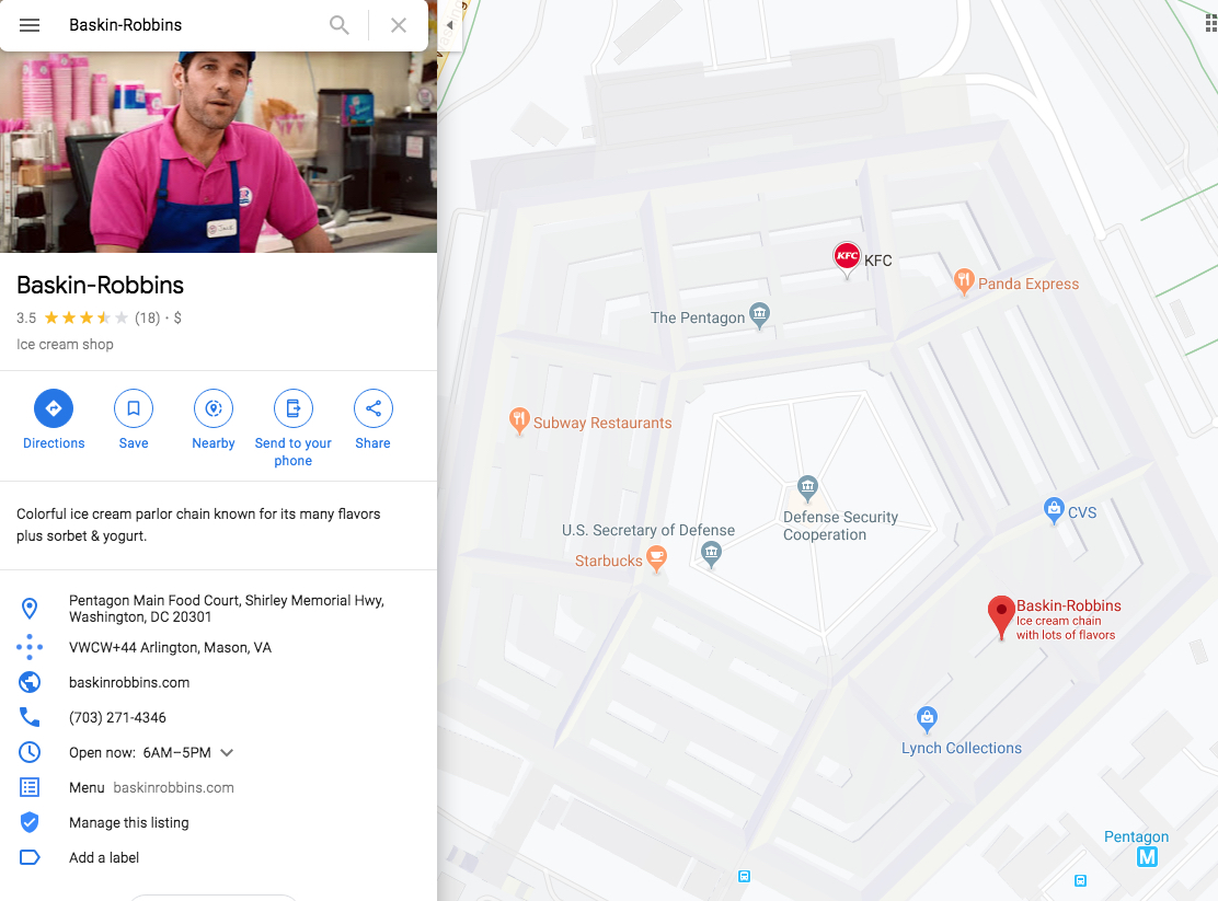 About a month ago, a local guide named Quinn wrote, “I found a missile in my ice cream. Will NOT be back.” Another, named Squillium Fancyson, lamented, “Went for a classic Rainbow sherbert, but got tackled by agents and got a Painful Sure hurt.” In Russian, someone wrote, “A good establishment, but the impression is spoiled by some tasteless pentagonal building in the neighborhood.”